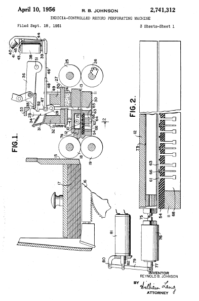 Indicia-Controlled Record Perforating Machine, US02741312, Johnson, R. B., September 18, 1951, 4 pages. Posted September 20, 2002. CD (HWDA10). SAMPLE PAGE. File size 248 KB PDF