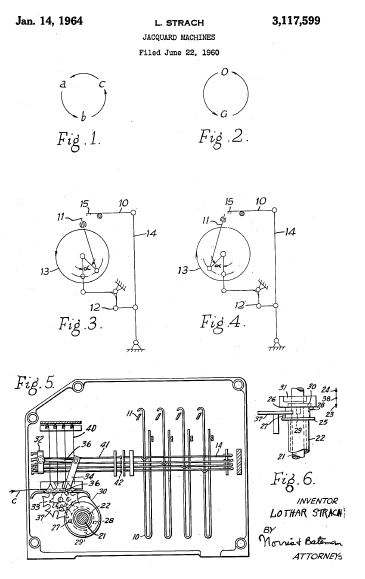 Jacquard Machines, US03117599, Strach, L., June 22, 1960, 4 pages. Posted March 5, 2002. CD (HWDA10). SAMPLE PAGE. File size 332 KB PDF