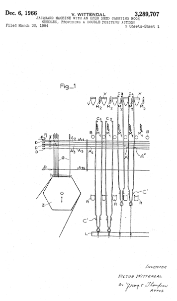 Jacquard Machine with an Open Shed Carrying Hook Needles, Providing a Double Positive Action, US03289707, Wittendal, V., March 30, 1964, 6 pages. Posted March 5, 2002. CD (HWDA10). SAMPLE PAGE. File size 372 KB PDF