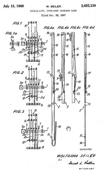 Double-Lift, Open-Shed Jacquard Loom, US03455339, Seiler, W., July 15, 1969, 3 pages. Posted March 5, 2002. CD (HWDA10). SAMPLE PAGE. File size 224 KB PDF