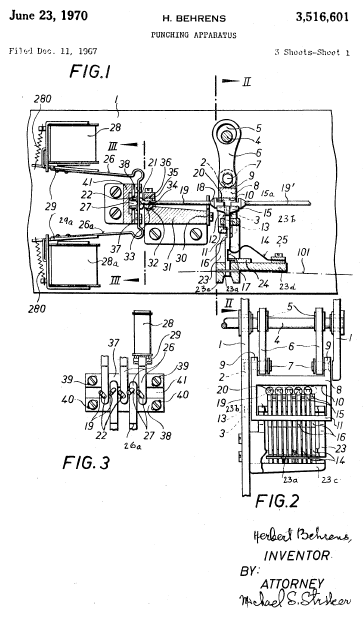 Punching Apparatus, US03516601, Gehrens, H., December 11, 1967, 11 pages. Posted September 20, 2002. CD (HWDA10). SAMPLE PAGE. File size 1 MB PDF