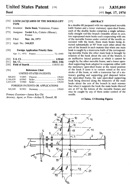 Loom Jacquards of the Double-Lift Type, US03835895, Bassi, Dario, September 17, 1974, 8 pages. Posted March 5, 2002. CD (HWDA10). SAMPLE PAGE. File size 452 KB PDF