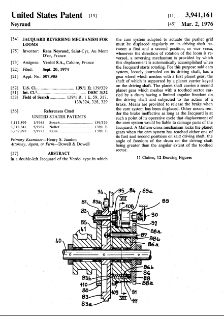 Jacquard Reversing Mechanism for Looms , US03941161, Neyraud, Rene, March 2, 1976, 14 pages. Posted March 5, 2002. CD (HWDA10). SAMPLE PAGE. File size 828 KB PDF
