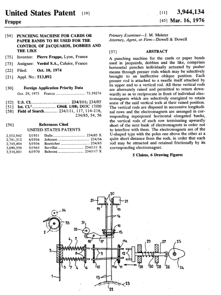Punching Machine for Cards or Paper Bands to be Used for the Control of Jacquards, Dobbies and the Like , US03944134, Frappe, Pierre, March 16, 1976 , 12 pages. Posted March 5, 2002. CD (HWDA10). SAMPLE PAGE. File size 520 KB PDF