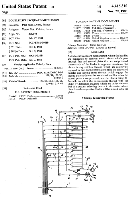 Double-Lift Jacquard Mechanism, US04416310, Sage, Paul, November 22, 1983, 16 pages. Posted March 2, 2003. CD (HWDA10). SAMPLE PAGE. File size 1 MB PDF