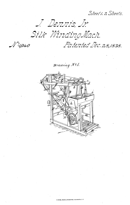 Silk Winding Machine, US00001040, Dennis, J. Jr., December 28, 1838, 5 pages. Posted July 18, 2003. CD (HWDA10). SAMPLE PAGE. File size 700 KB PDF