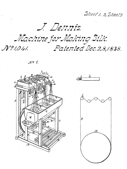 Machine for Making Silk, US00001041, Dennis, J., December 28, 1838, 4 pages. Posted July 18, 2003. CD (HWDA10). SAMPLE PAGE. File size 644 KB PDF