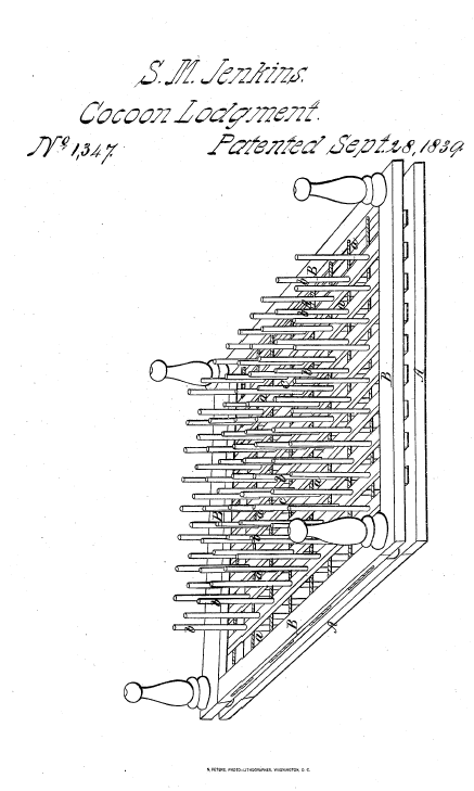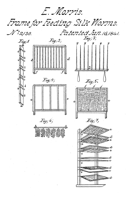Frame for Feeding Silk Worms, US00002130, Morris, E., June 16, 1841, 4 pages. Posted July 19, 2003. CD (HWDA10). SAMPLE PAGE. File size 672 KB PDF