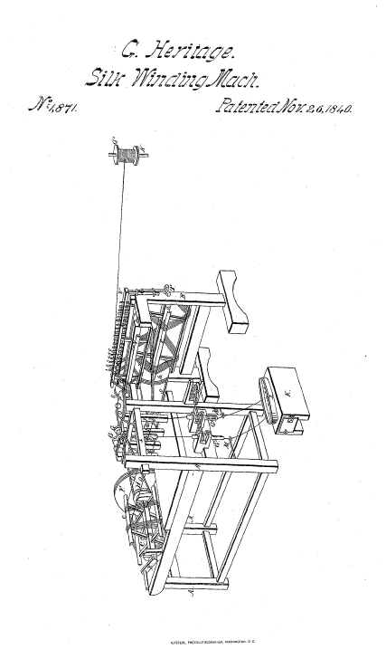 Silk Winding Machine, US00001871, Heritage, G., November 26, 1840, 2 pages. Posted July 18, 2003. CD (HWDA10). SAMPLE PAGE. File size 524 KB PDF