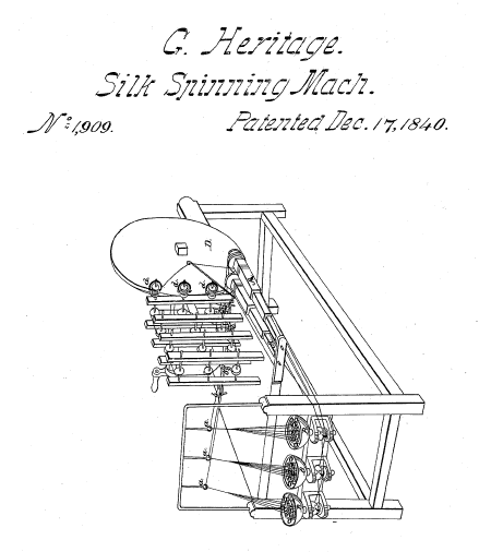 Silk Spinning Machinery, US00001909, Hertitage, G., December 17, 1840, 3 pages. Posted July 19, 2003. CD (HWDA10). SAMPLE PAGE. File size 548 KB PDF