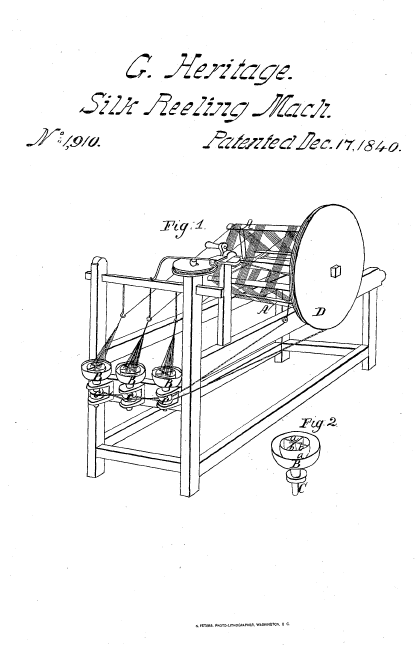 Silk Winding Machine, US00001910, Heritage, G., December 17, 1840, 2 pages. Posted July 19, 2003. CD (HWDA10). SAMPLE PAGE. File size 548 KB PDF