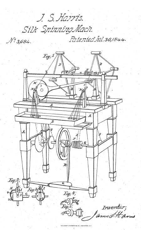 Silk Spinning Machine, US00003684, Harris, J. S., July 30, 1844, 2 pages. Posted July 19, 2003. CD (HWDA10). SAMPLE PAGE. File size 576 KB PDF