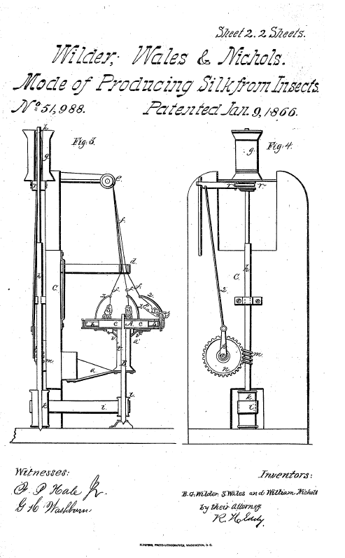 Mode of Producing Silk from Insects, US00051988, Wilder, Wales & Nichols, January 9, 1866, 4 pages. Posted January 2, 2004. CD (HWDA10). SAMPLE PAGE. File size 630 KB PDF