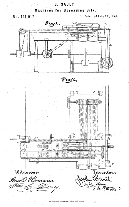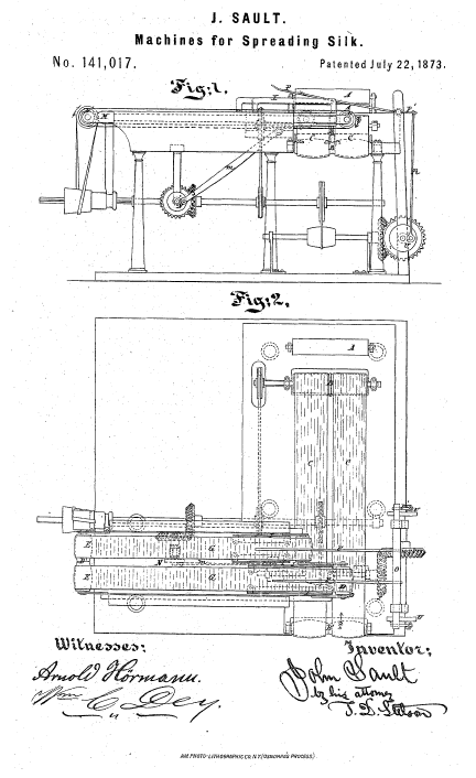 Machines for Spreading Silk, US00141017, Sault, J., July 22, 1873, 3 pages. Posted January 17, 2005. SAMPLE PAGE. File size 568 KB PDF