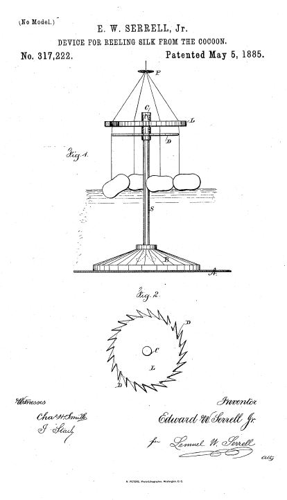 Device for Reeling Silk from the Cocoon, US00317222, Serrell, E. W. Jr., May 5, 1885, 2 pages. Posted January 20, 2004. CD (HWDA09). SAMPLE PAGE. File size 504 KB PDF