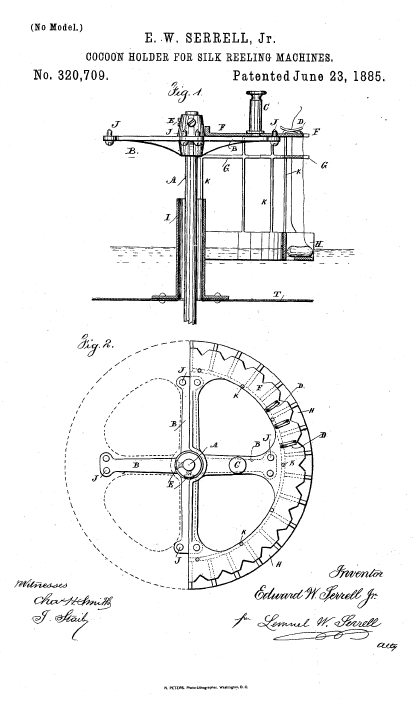 Cocoon Holder for Silk Reeling Machines, US00320709, Serrell, E. W. Jr., June 23, 1885, 2 pages. Posted January 20, 2004. CD (HWDA09). SAMPLE PAGE. File size 524 KB PDF