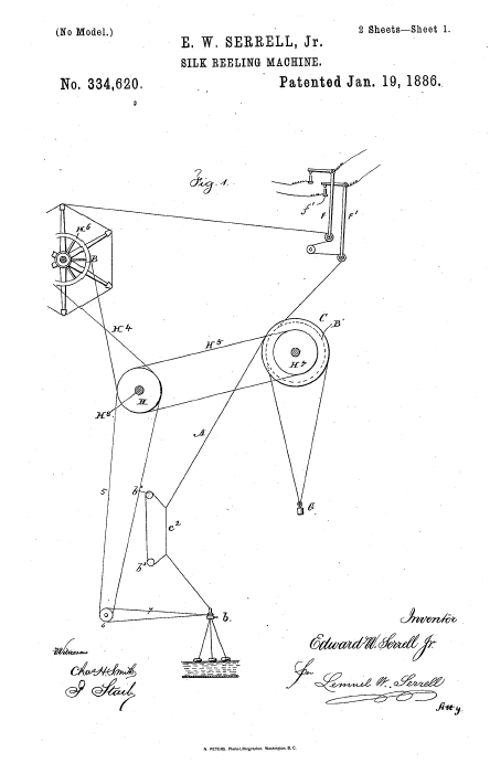 Silk Reeling Machine, US00334620, Serrell, E. W. Jr., January 19, 1886, 4 pages. Posted January 20, 2004. CD (HWDA09). SAMPLE PAGE. File size 584 KB PDF
