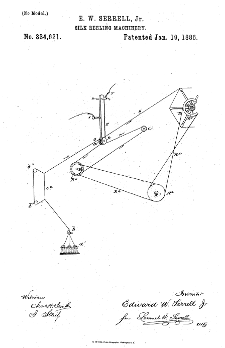 Silk Reeling Machine, US00334619, Serrell, E. W. Jr., January 19, 1886, 3 pages. Posted January 20, 2004. CD (HWDA09). SAMPLE PAGE. File size 548 KB PDF