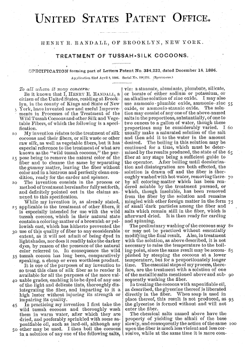 Treatment of Tussah-Silk Cocoons, US00354222, Randall, Henry B., December 14, 1866, 2 pages. Posted June 15, 2004. SAMPLE PAGE. File size 536 KB PDF