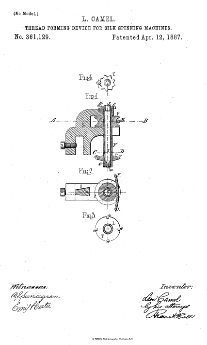 Thread Forming Device for Silk Spinning Machines, US00361129, Camel, L., April 12, 1887, 4 pages. Posted June 15, 2004. SAMPLE PAGE. File size 732 KB PDF