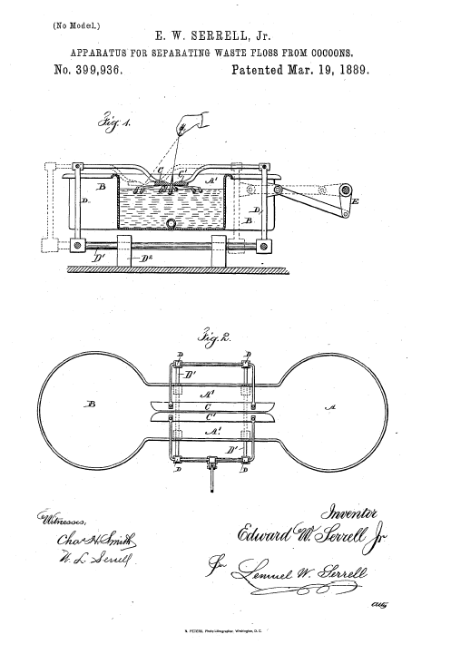 Apparatus for Separatur Wast Floss from Cocoons, US00399936, Serrell, E. W. Jr., March 19, 1889, 3 pages. Posted June 15, 2004. SAMPLE PAGE. File size 628 KB PDF