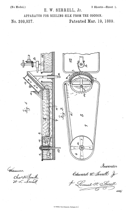 Apparatus for Reeling Silk from the Cocoon, US00399937, Serrell, E. W. Jr., March 19, 1889, 6 pages. Posted June 15, 2004. SAMPLE PAGE. File size 760 KB PDF