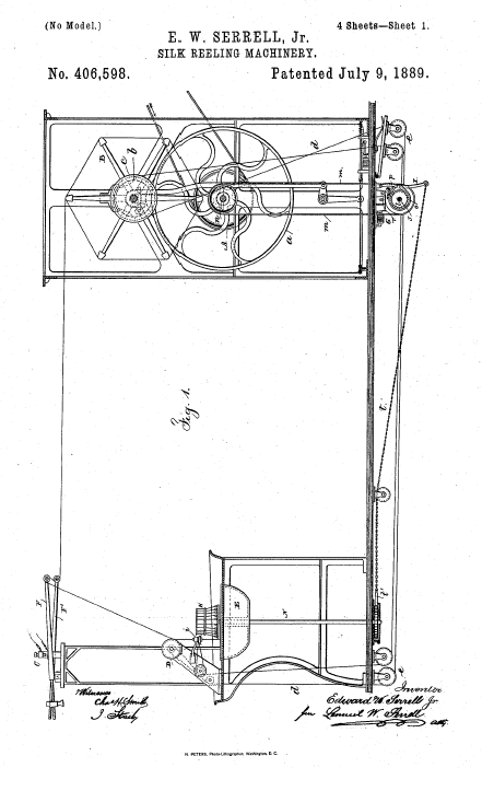 Silk Reeling Machinery, US00406598, Serrell, E. W. Jr., July 9, 1889, 9 pages. Posted June 15, 2004. SAMPLE PAGE. File size 1 MB PDF