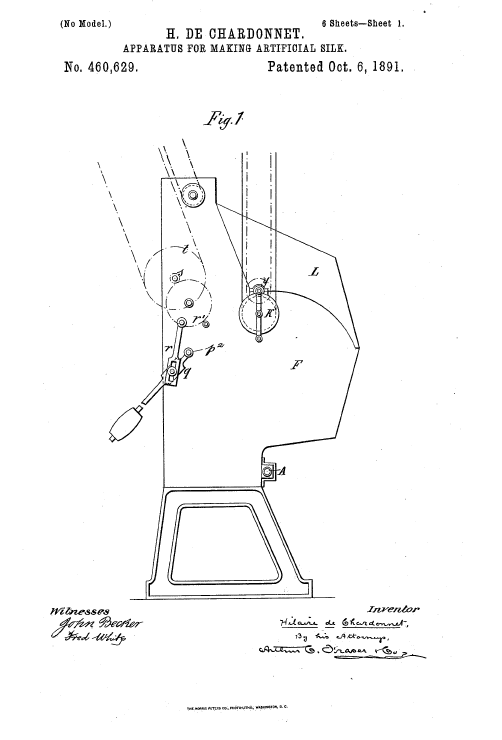 Apparatus for Making Artificial Silk, US00460629, Chardonnet, H. de, October 6, 1891, 11 pages. Posted September 13, 2004. CD (HWDA10). SAMPLE PAGE. File size 1.1 MB PDF