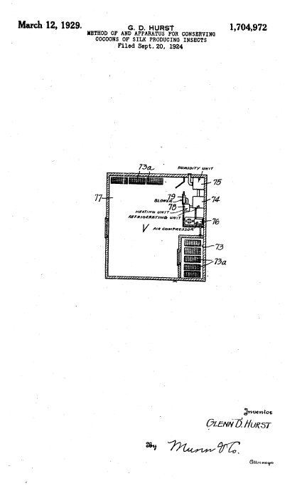 Method of and Apparatus for Conserving Coccoons of Silk Producing Insects, US01704972, Hurst, G. D., March 12, 1929, 4 pages. Posted February 5, 2005. SAMPLE PAGE. File size 756 KB PDF