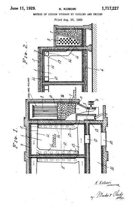 Method of Cocoon Storage by Cooling and Drying, US01717227.pdf, Kobori, K., June 11, 1929, 3 pages. Posted February 5, 2005. SAMPLE PAGE. File size 632 KB PDF