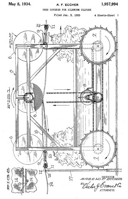 Tree Coverer for Silkworm Culture, US01957994, Eccher, A. F., January 9, 1933, 7 pages. Posted February 9, 2005. SAMPLE PAGE. File size 808 KB PDF