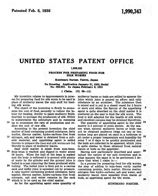 Process for Preparing Food for Silk Worms, US01990343, Maruse, Kunimaro, February 5, 1935, 1 page. Posted February 9, 2005. SAMPLE PAGE. File size 472 KB PDF