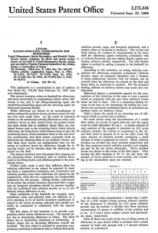 Eating-Inducing Compositions for Wilkworms, US03275446, Hamamura, Yasuji, et al, September 27, 1966, 2 pages. Posted February 9, 2005. SAMPLE PAGE. File size 628 KB PDF