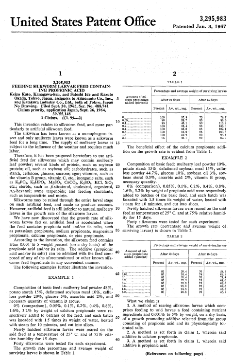 Feeding Silkworm Larvae Feed Containing Propionic Acid, US03295983, Kato, Keizo, et al, January 3, 1967, 2 pages. Posted February 9, 2005. SAMPLE PAGE. File size 496 KB PDF