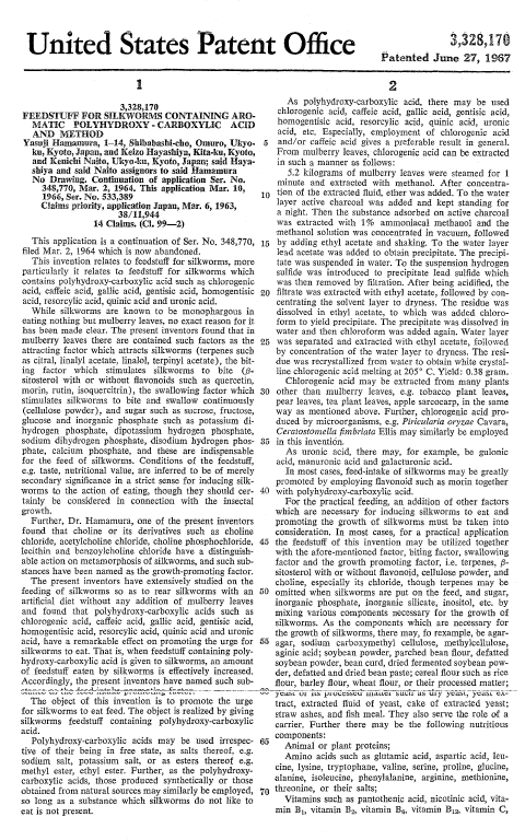 Feedstuff for Silkworms Containing Aromatic Polyhydroxy-Carboxylic Acid and Method, US03328170, Hamamura, Yasuji, et al, June 27, 1967, 4 pages. Posted March 6, 2005. SAMPLE PAGE. File size 740 KB PDF