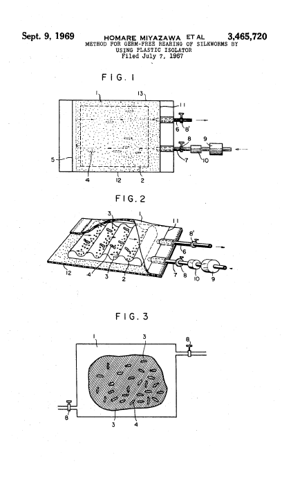 Method for Germ-Free Rearing of Silkworms by Using Plastic Insulator, US03465720, Miyazawa, Homare, et al, September 9, 1969, 5 pages. Posted March 6, 2005. SAMPLE PAGE. File size 748 KB PDF