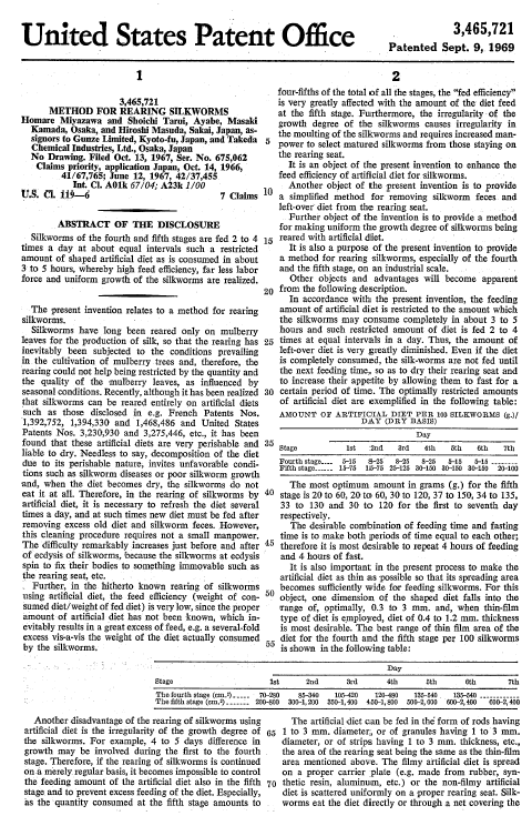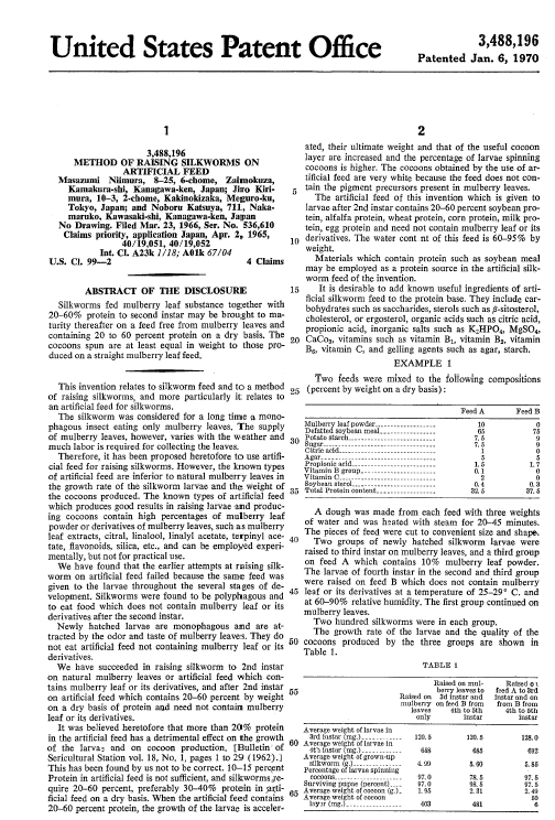 Method of Raising Silkworms on Artificial Feed, US03488196, Niimura, Masazumi, et al, January 6, 1970, 2 pages. Posted March 6, 2005. SAMPLE PAGE. File size 588 KB PDF