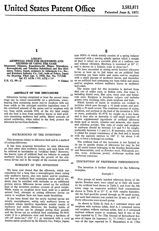 Artificial Feed for Silkworms and Method of Using the Same, US03583871, Niimura, Masazumi, et al, June 8, 1971, 3 pages. Posted March 6, 2005. SAMPLE PAGE. File size 632 KB PDF