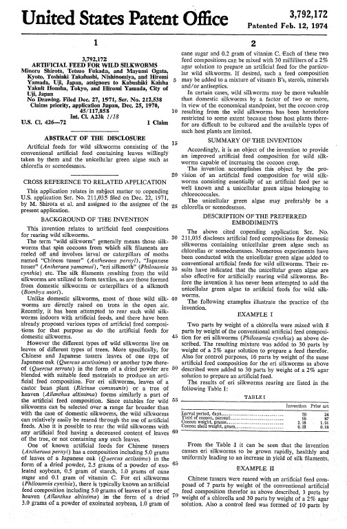 Artificial Feed for Wild Silkworms, US03792172, Shirota, Minoru, et al, Feburary 12, 1974, 2 pages. Posted March 6, 2005. SAMPLE PAGE. File size 548 KB PDF