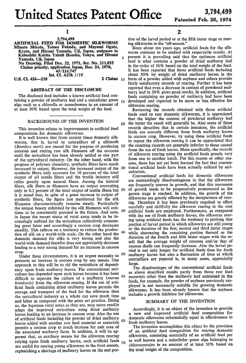 Artificial Feed for Domestic Silkworms, US03794499, Shirota, Minoru, et al, Feburary 26 1974, 3 pages. Posted March 6, 2005. SAMPLE PAGE. File size 652 KB PDF