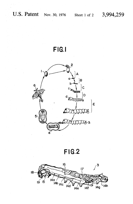 Method of Inducing Moult of Silkworms, US03230930, Hamamura, Yasuji, et al, January 25, 1966, 3 pages. Posted February 9, 2005. SAMPLE PAGE. File size 604 KB PDF