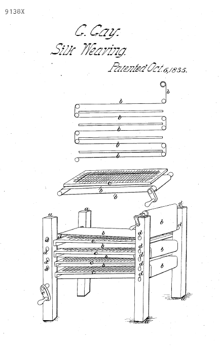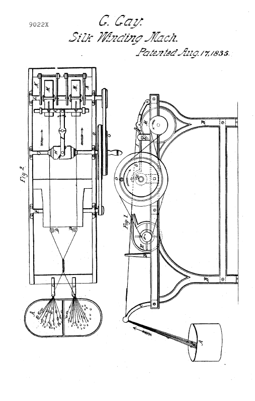 Silk Winding Machine, USX0009022, Gay, G., August 17, 1835, 3 pages. Posted January 2, 2004. CD (HWDA10). SAMPLE PAGE. File size 728 KB PDF