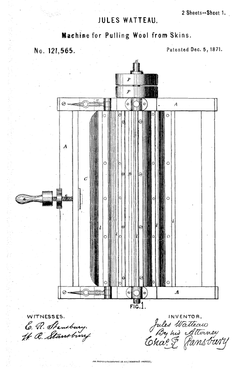 Machine for Pulling Wool from Skins, US00121565, Watteau, Jules, December 5, 1871, 3 pages. Posted June 15, 2004. SAMPLE PAGE. File size 560 KB PDF