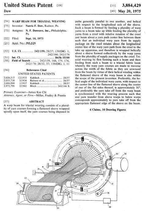 Warp Beam for Triaxial Weaving, US03884429, Dow, Norris F., May 20, 1975, 10 pages. Posted March 2, 2003. CD (HWDA10). SAMPLE PAGE. File size 1.1 MB PDF