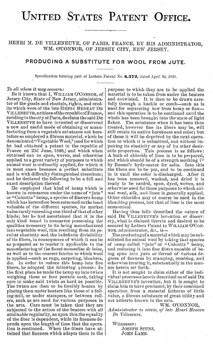 Producing a Substitute for Wool from Jute, US00006372, O'Connor, William, April 24, 1849, 1 page. Posted September 12, 2004. CD (HWDA10). SAMPLE PAGE. File size 448 KB PDF