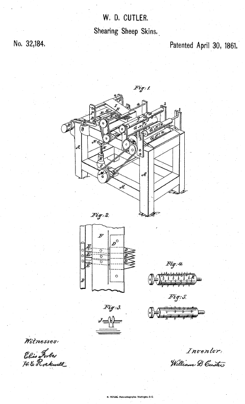 Shearing Sheep Skins, US00032184, Cutler, W. D., April 30, 1861, 3 pages. Posted January 2, 2004. CD (HWDA10). SAMPLE PAGE. File size 580 KB PDF