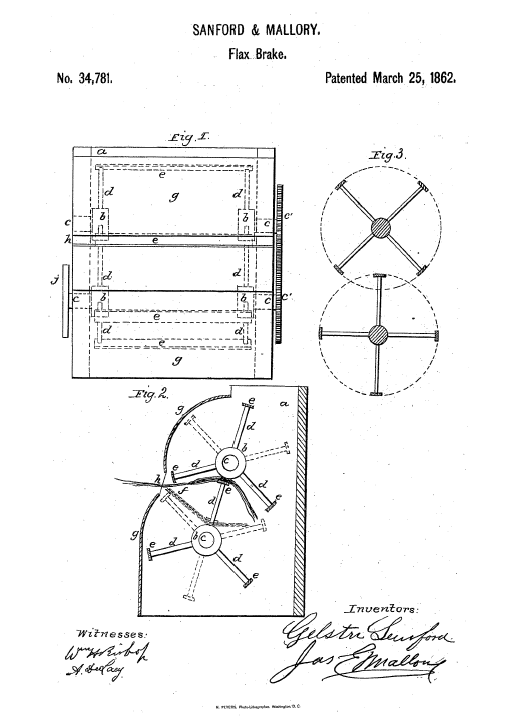 Improvement in Machinery for Scutching Flax and Hemp, US00034781, Sanford, Gelston and James E. Mallory, March 25, 1862, 3 pages. Posted November 3, 2004. CD (HWDA11). SAMPLE PAGE. File size 552 KB PDF