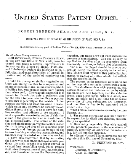 Improved Mode of Separating the Fibers of Flax, Hemp, &c., US00041350, Shaw, R. Tennent, January 19, 1864, 1 page. Posted September 12, 2004. CD (HWDA10). SAMPLE PAGE. File size 456 KB PDF