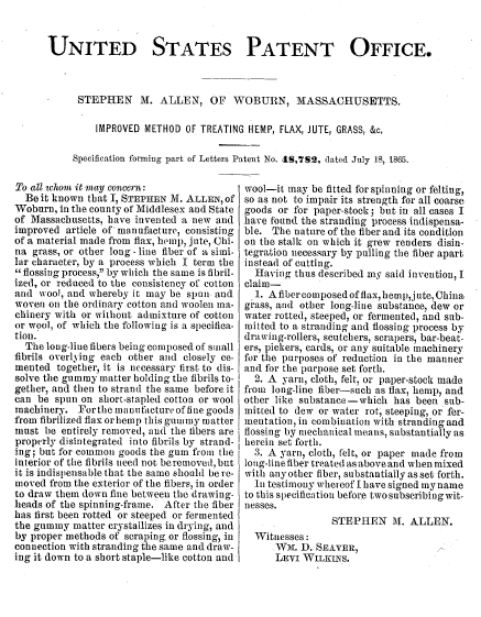 Improved Method of Treating Hemp, Flax, Jute, Grass, &c., US00048782, Allen, Stephen M., July 18, 1865, 1 page. Posted September 12, 2004. CD (HWDA10). SAMPLE PAGE. File size 452 KB PDF