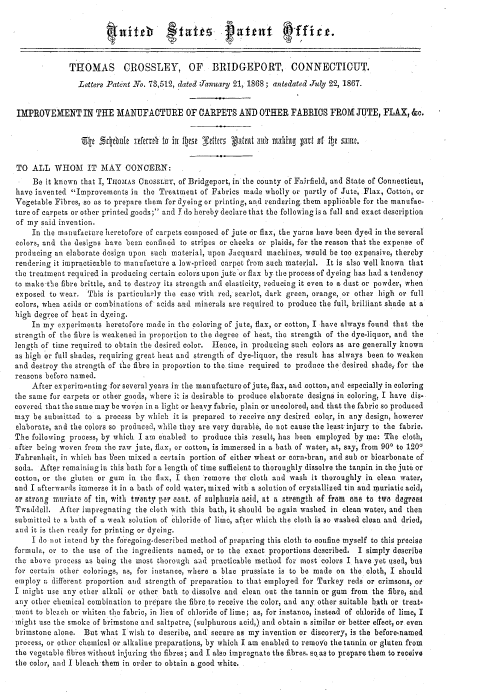 Improvements in the Manufacture of Carpets and other Fabrics from Jute, Flax, &c., US00073512, Crossley, Thomas, January 21, 1868, 2 pages. Posted September 12, 2004. CD (HWDA10). SAMPLE PAGE. File size 496 KB PDF